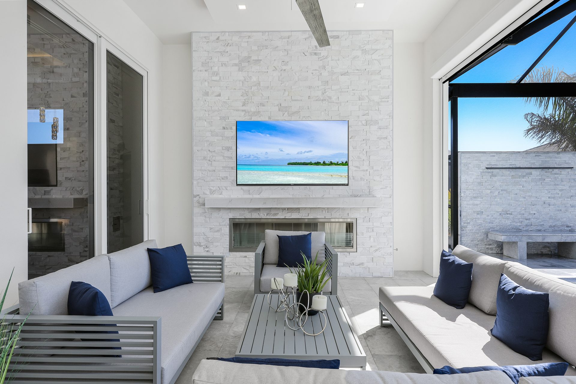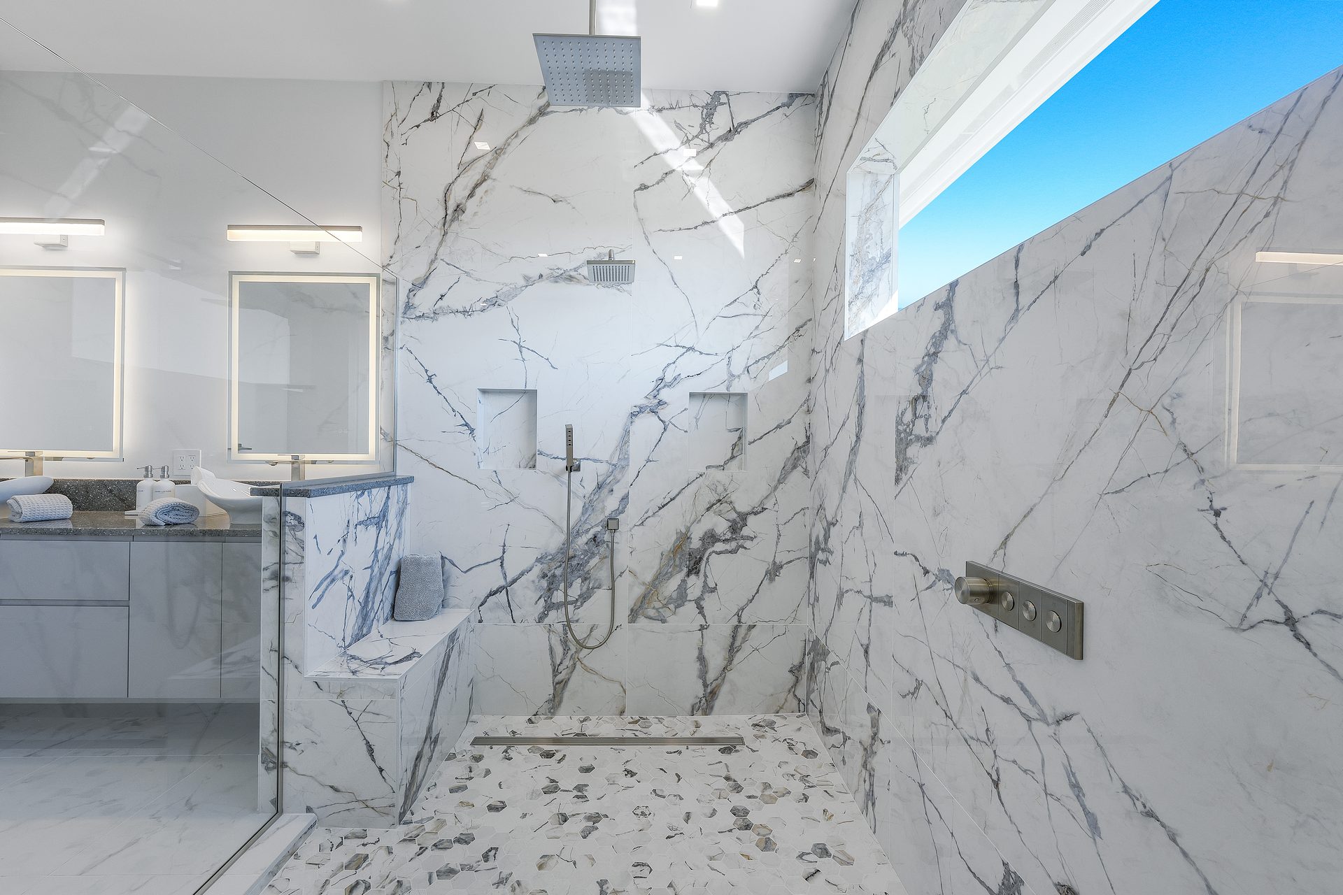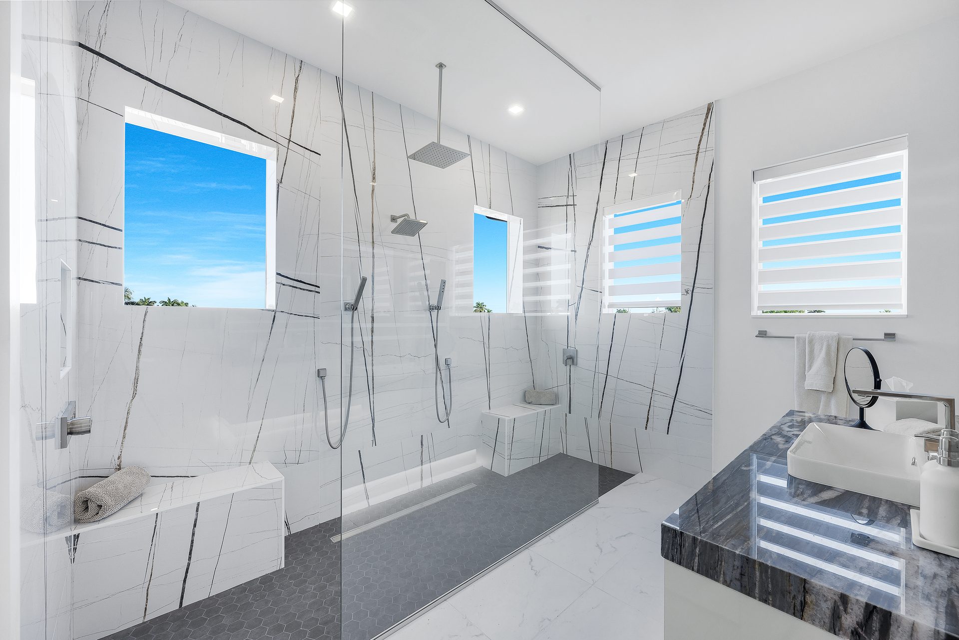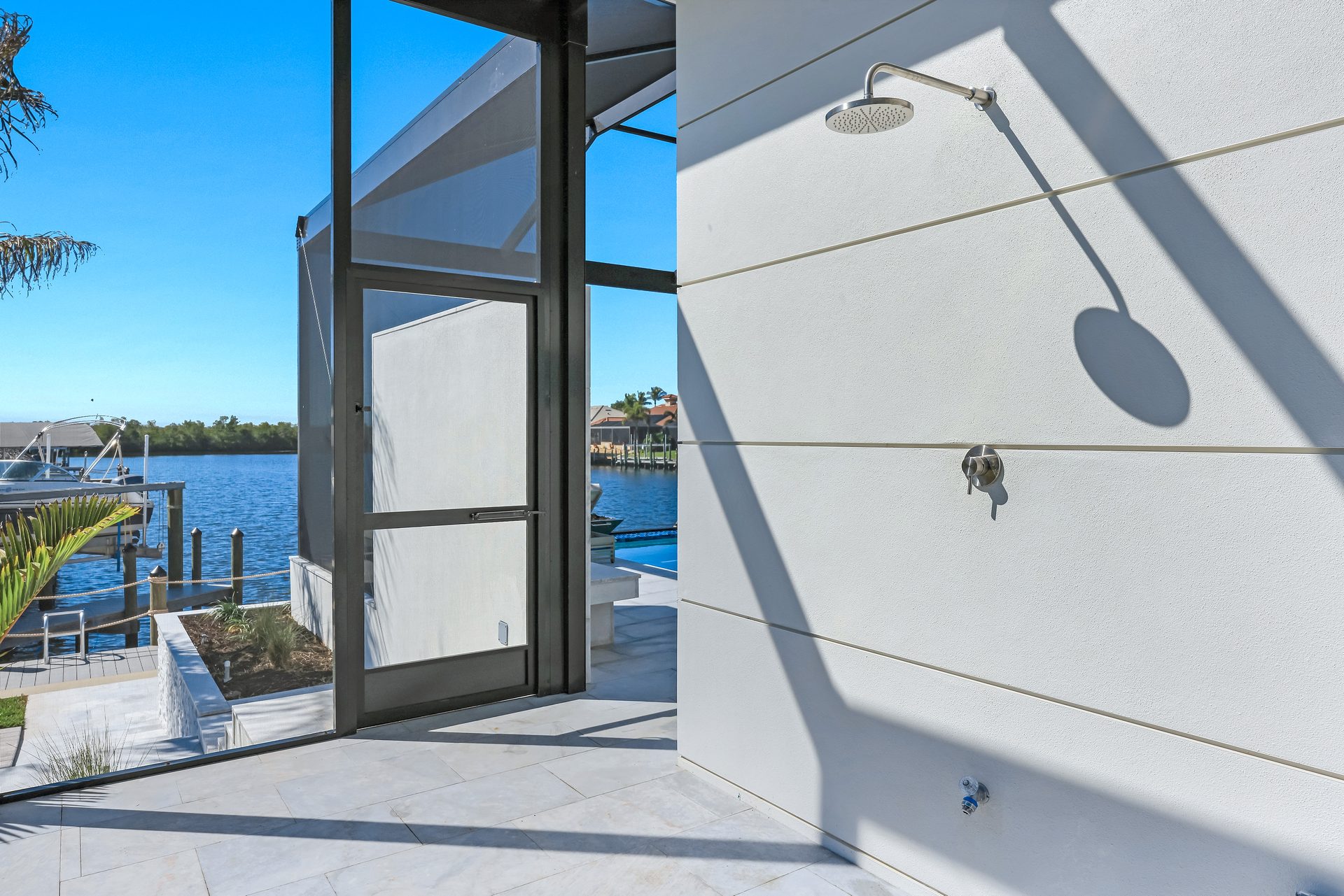 Der Außenbereich ist großzügig gestaltet. Der große Pool mit übergroßem Spa, Feuerschalen und einer Wasserfall-Dusche bildet das Zentrum der Terrasse.