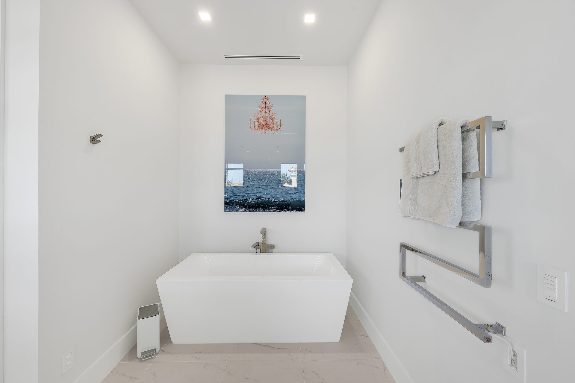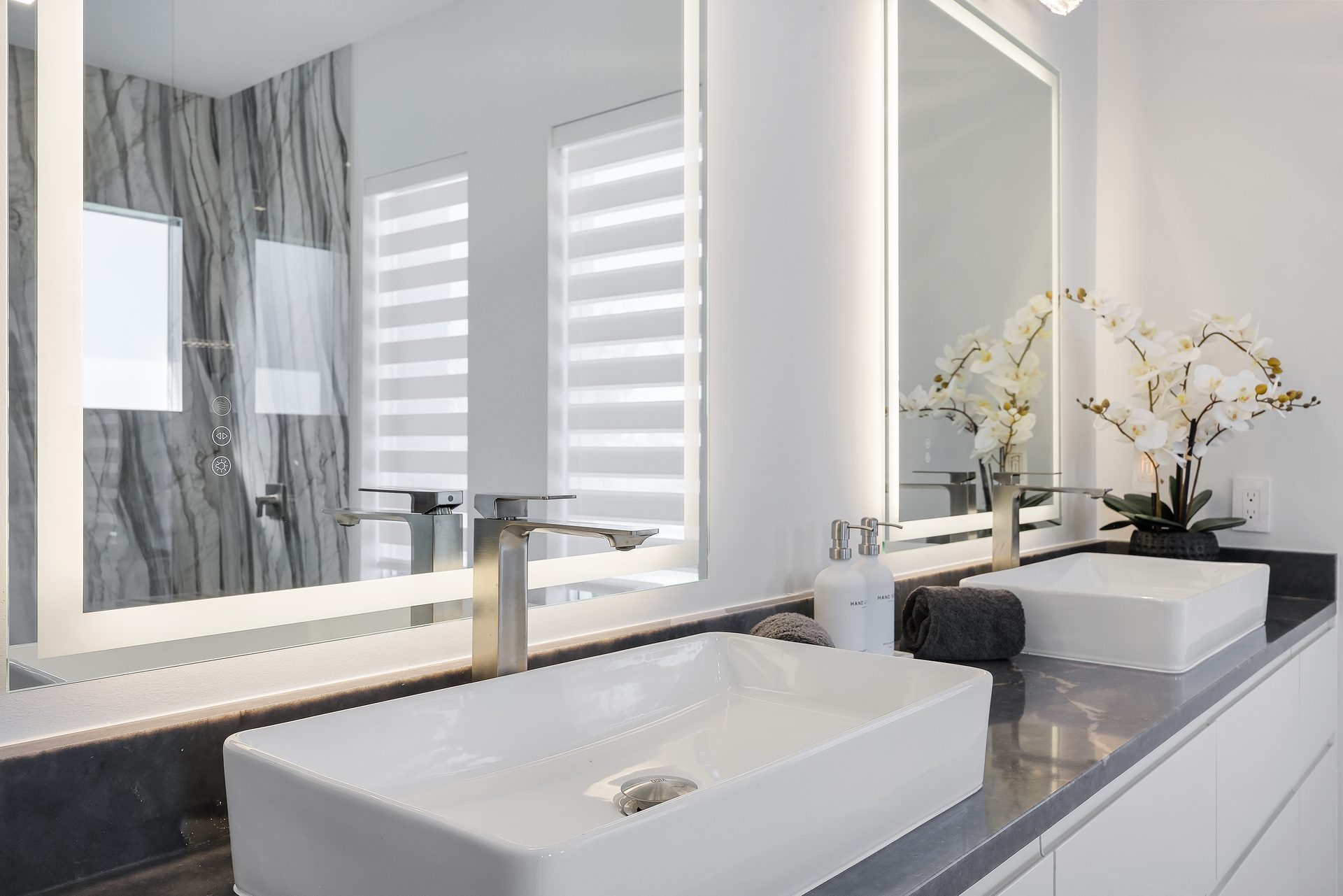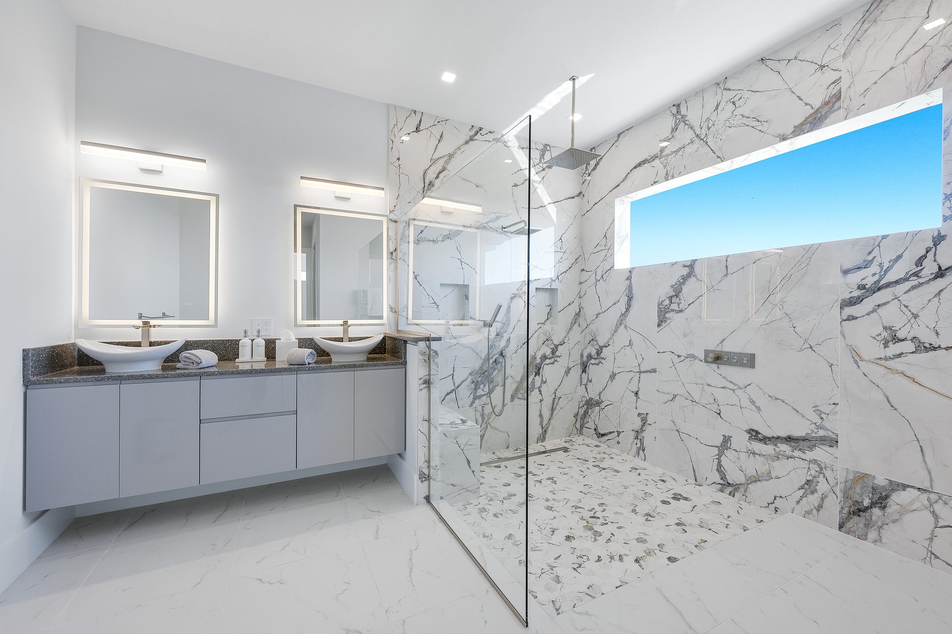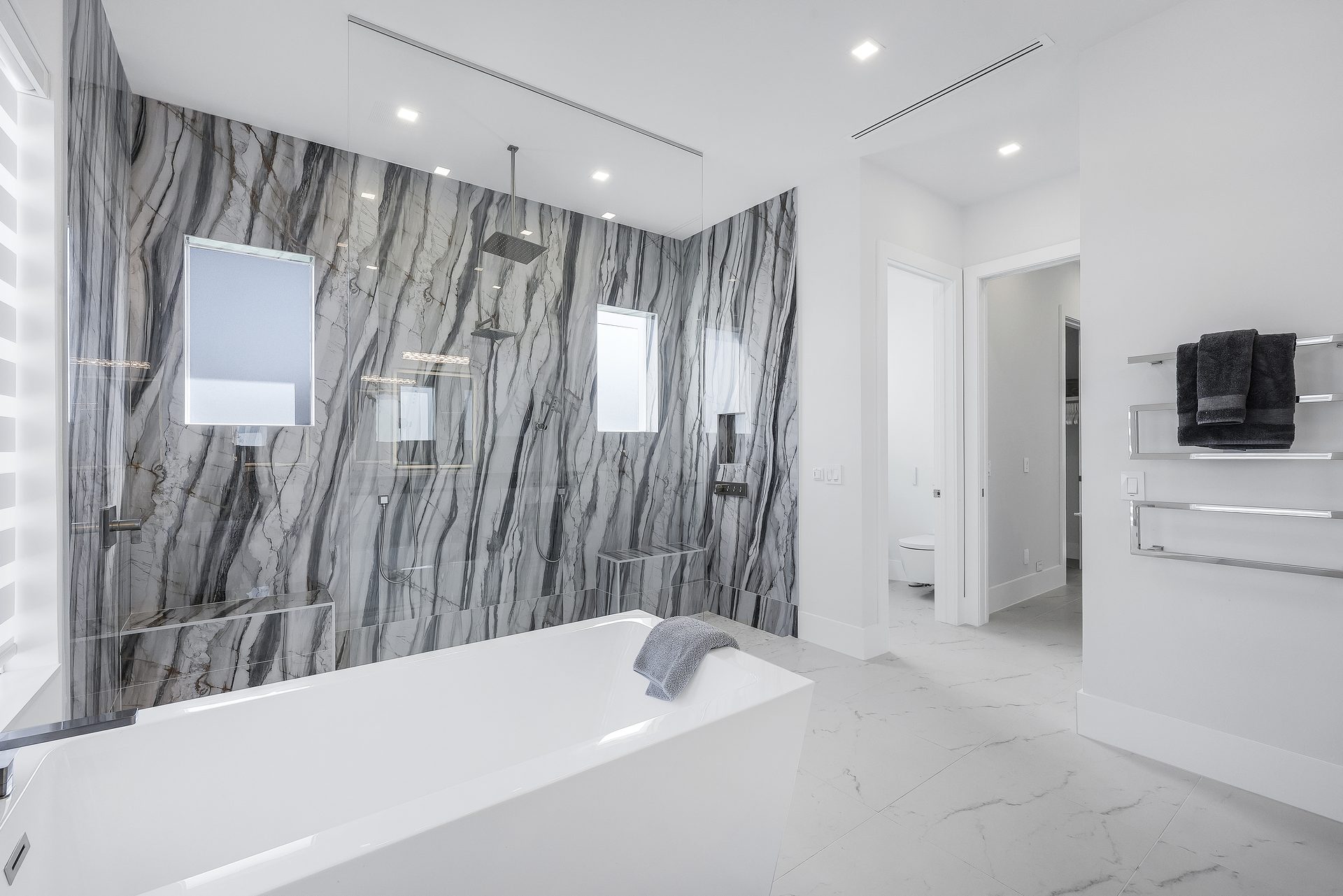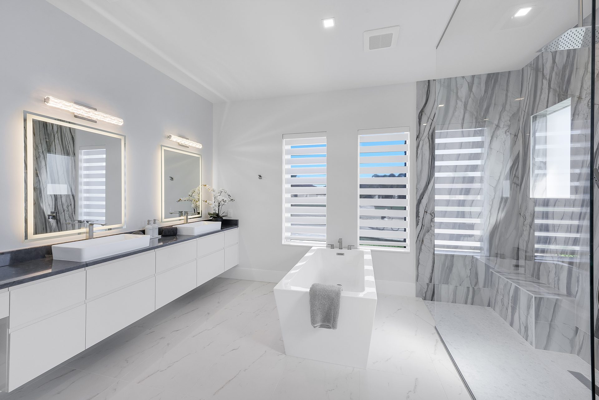 Der Außenbereich ist großzügig gestaltet. Der große Pool mit übergroßem Spa, Feuerschalen und einer Wasserfall-Dusche bildet das Zentrum der Terrasse.