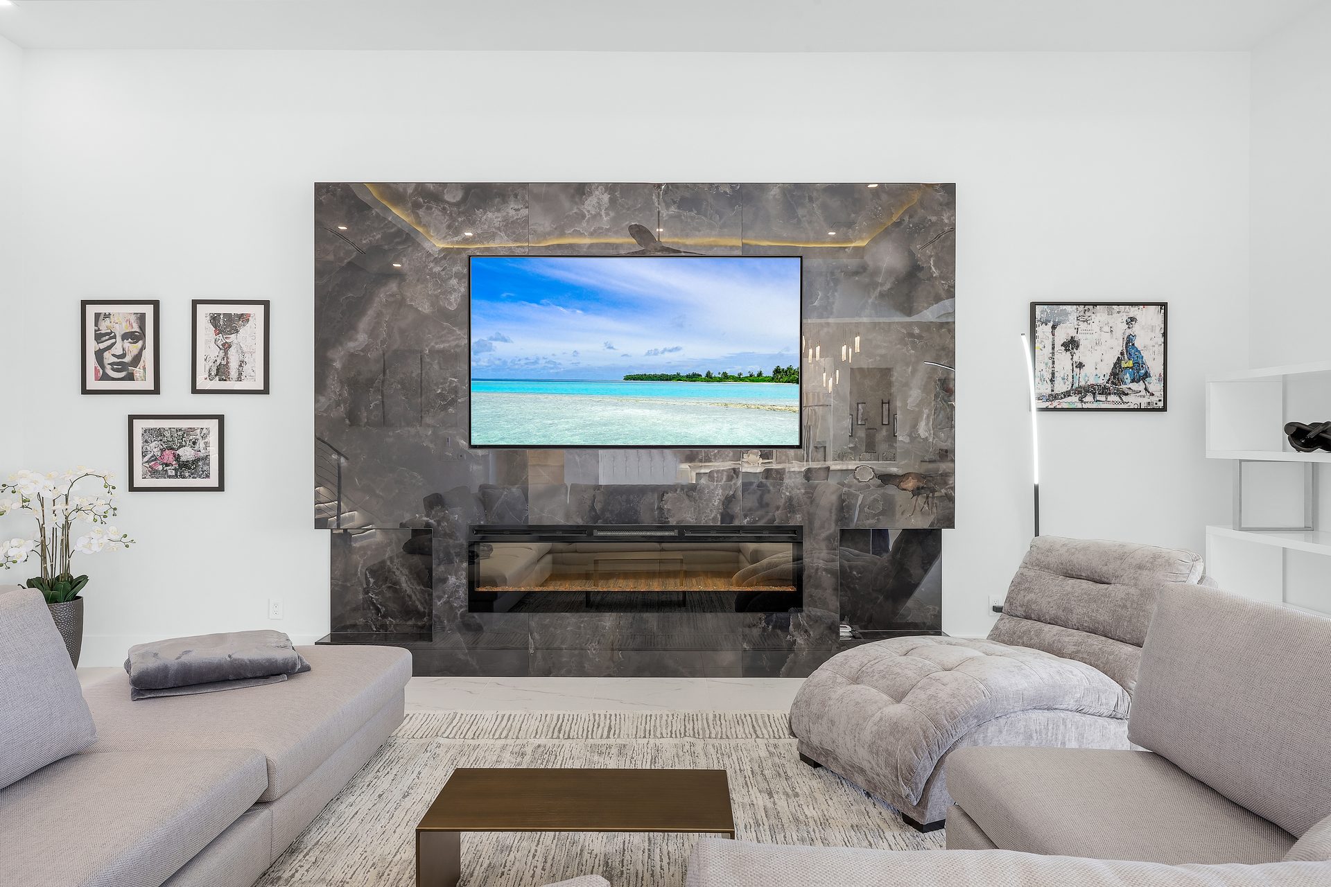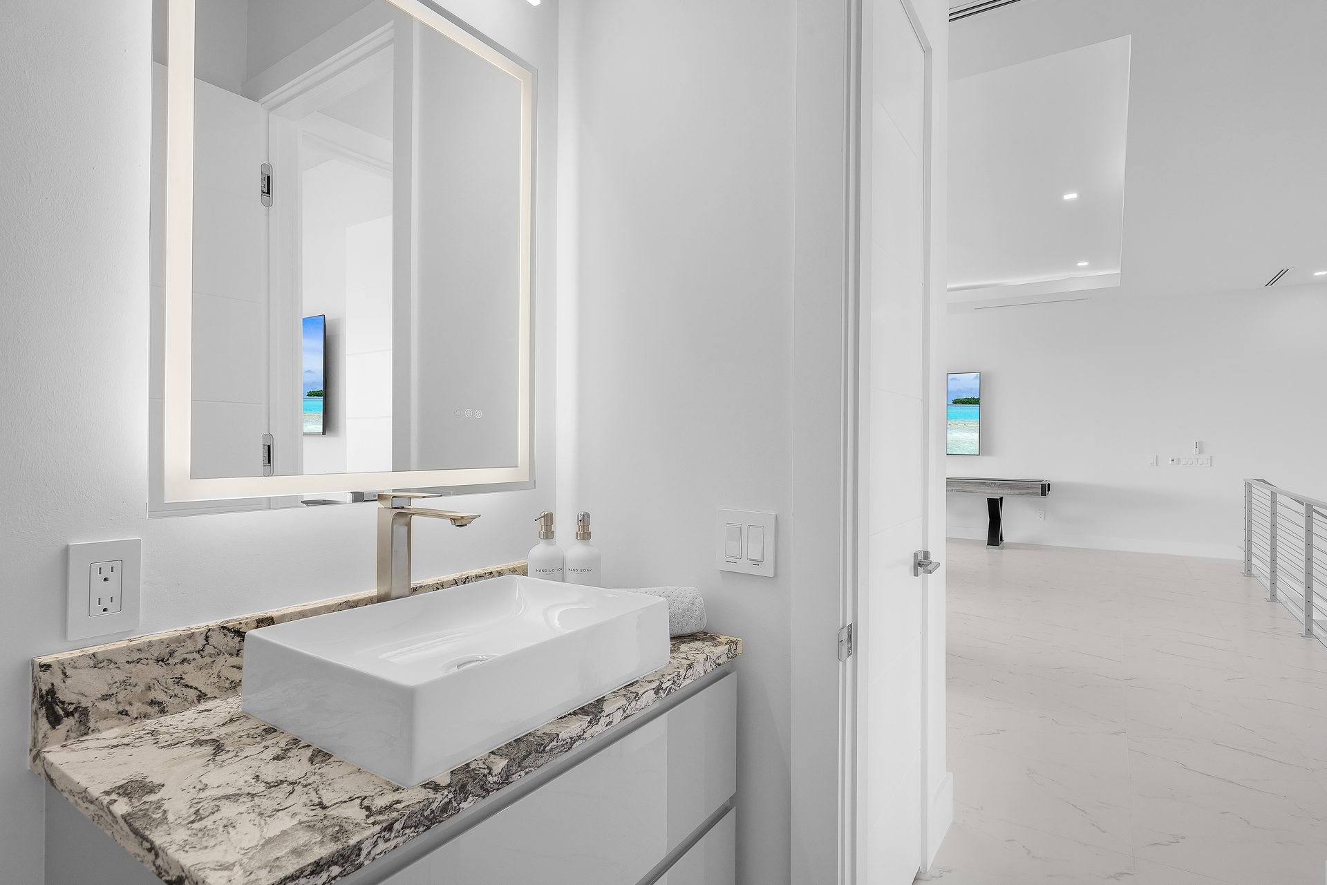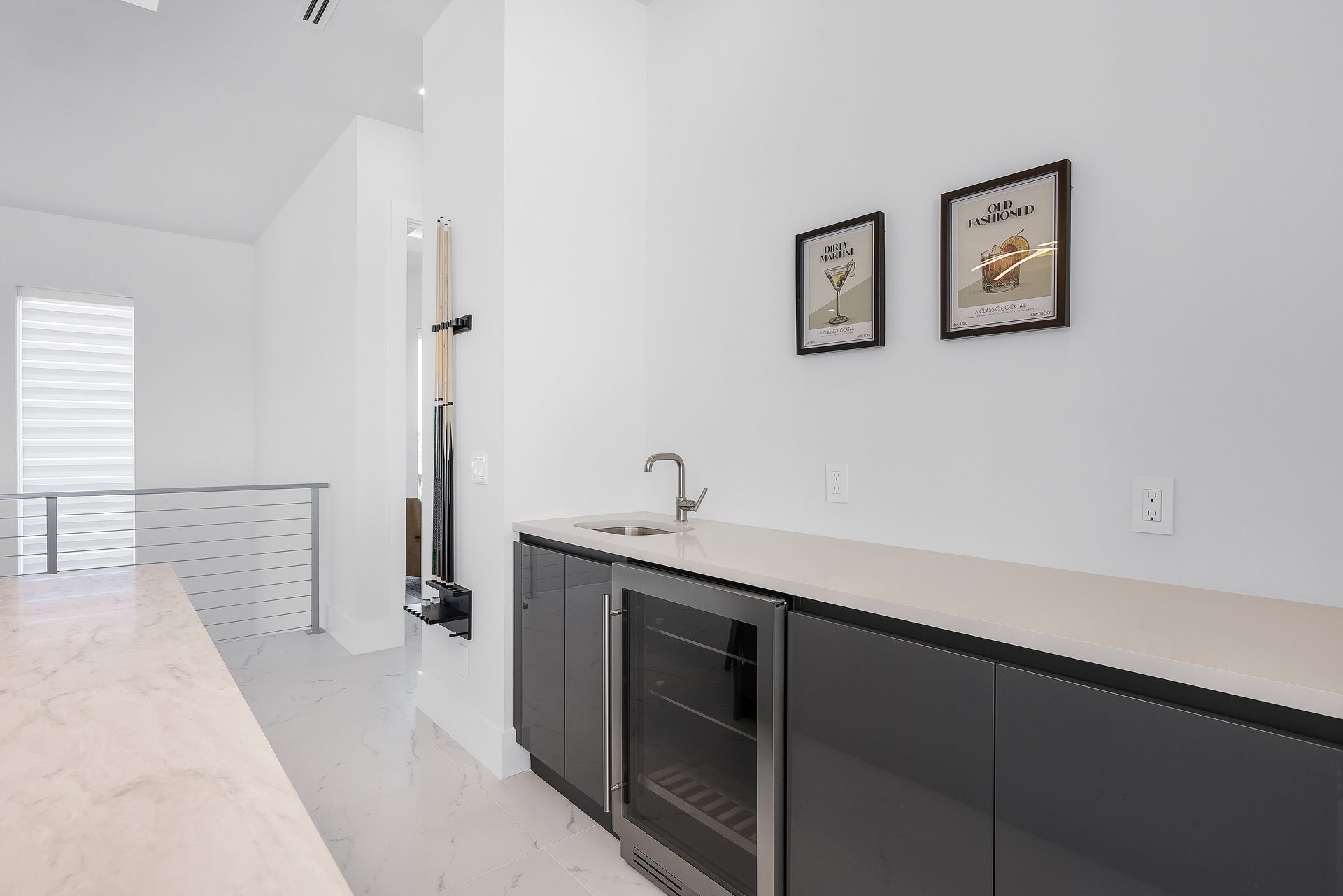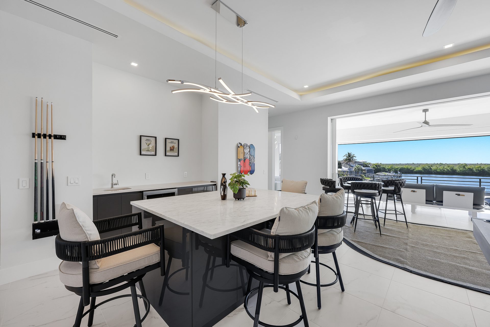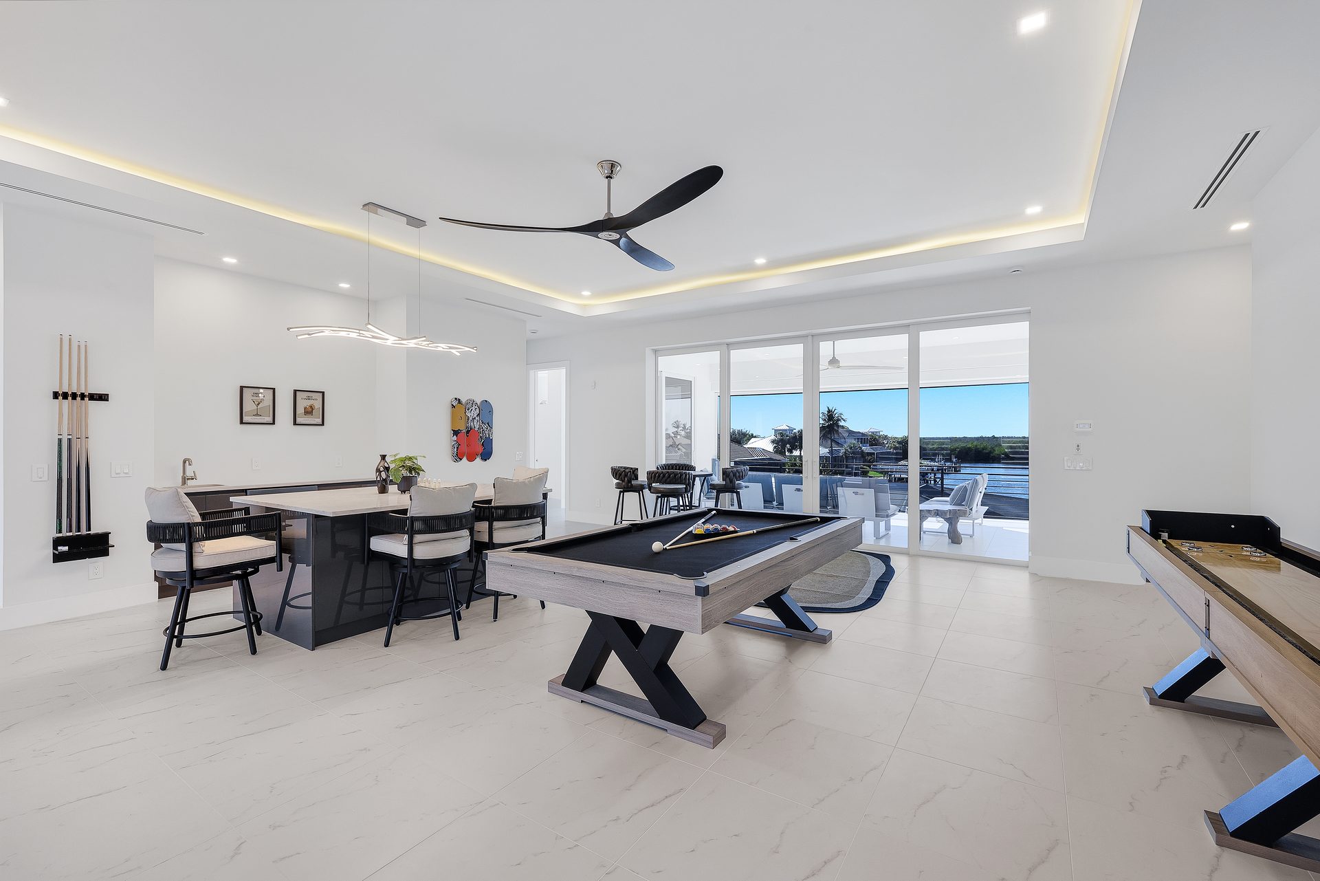 Im Obergeschoss befindet sich ein offener Game Room mit Billardtisch und Shuffleboard, eine Bar mit einerm weiteren Weinkühlschrank sowie ein TV.