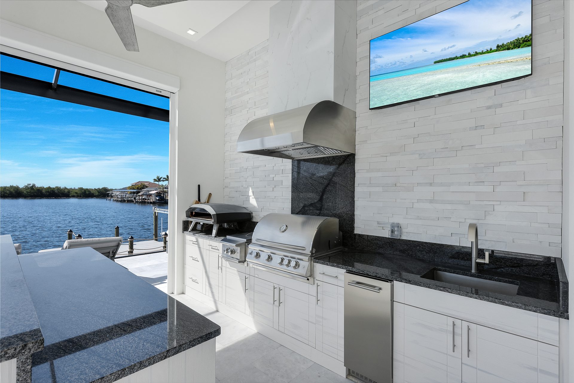 Die voll ausgestattete Outdoor-Küche bietet einen Pizzaofen, Ice Maker, Kühlschrank, Grill und TV. Außerdem stehen ein großer Esstisch, ein Lounge-Bereich, mehrere Sitzgruppen und Sonnenliegen sowie ein weiterer TV zur Verfügung. Eine Außendusche, eine große Terrasse im Obergeschoss sowie eine zusätzliche Dachterrasse runden das Angebot ab.