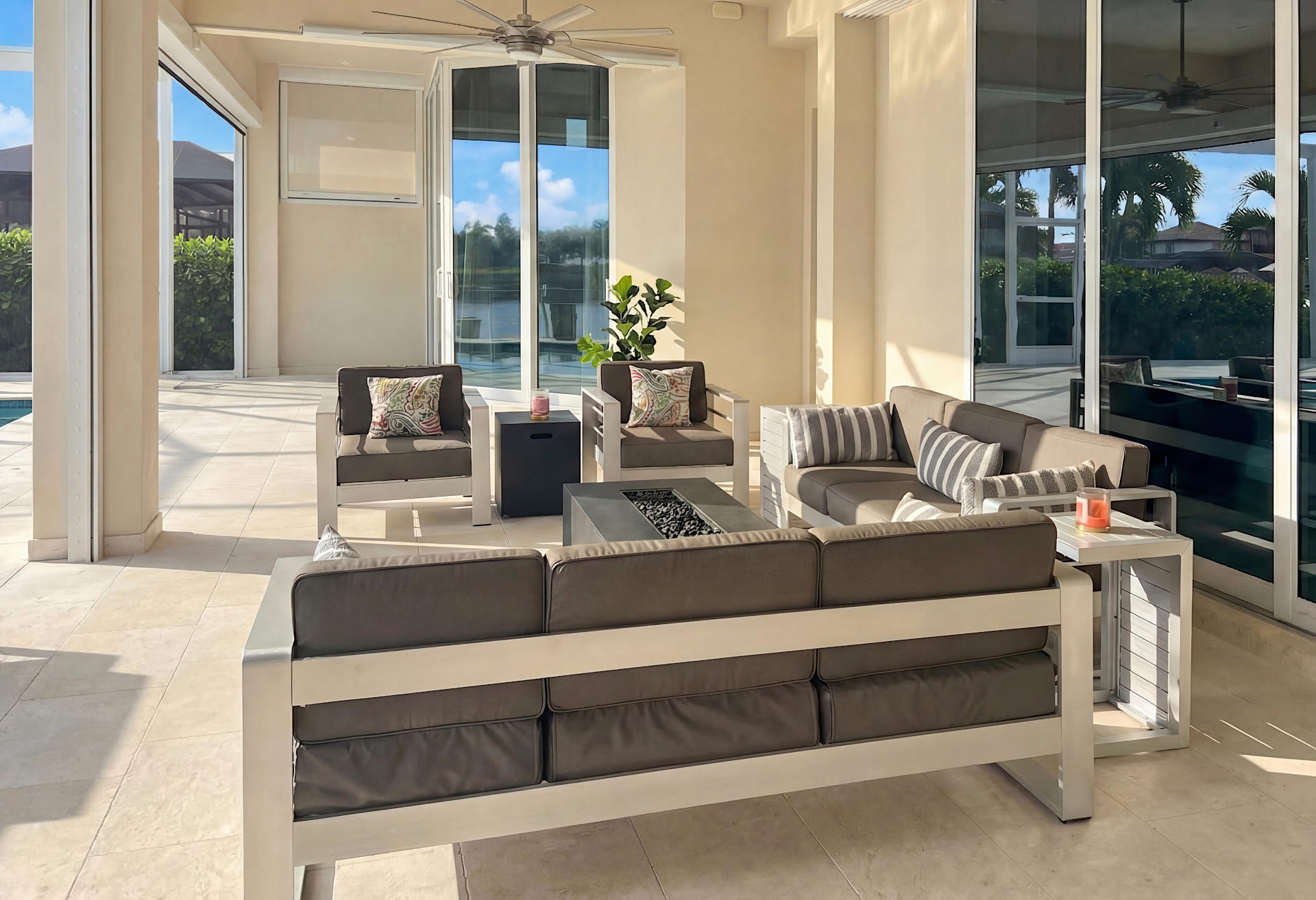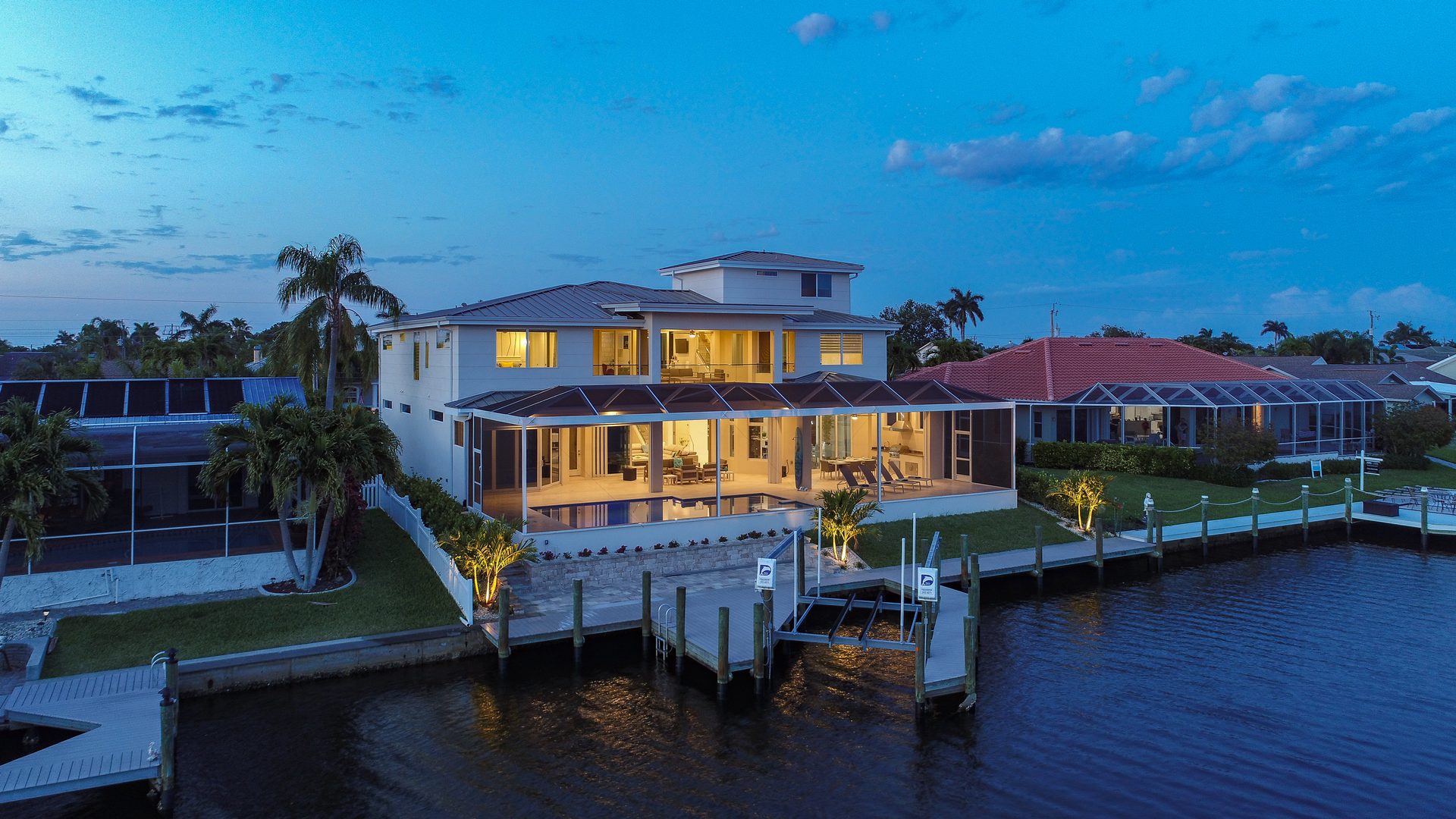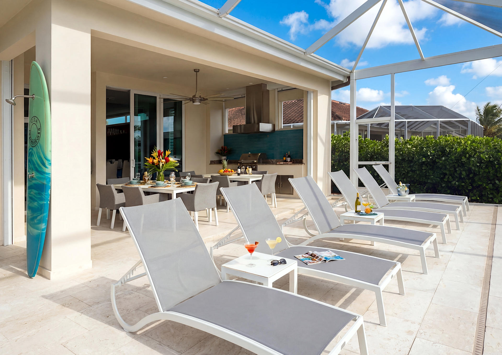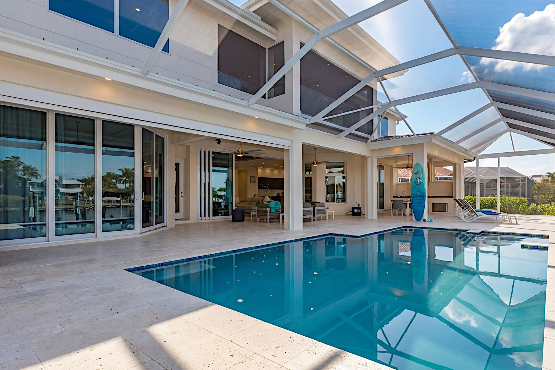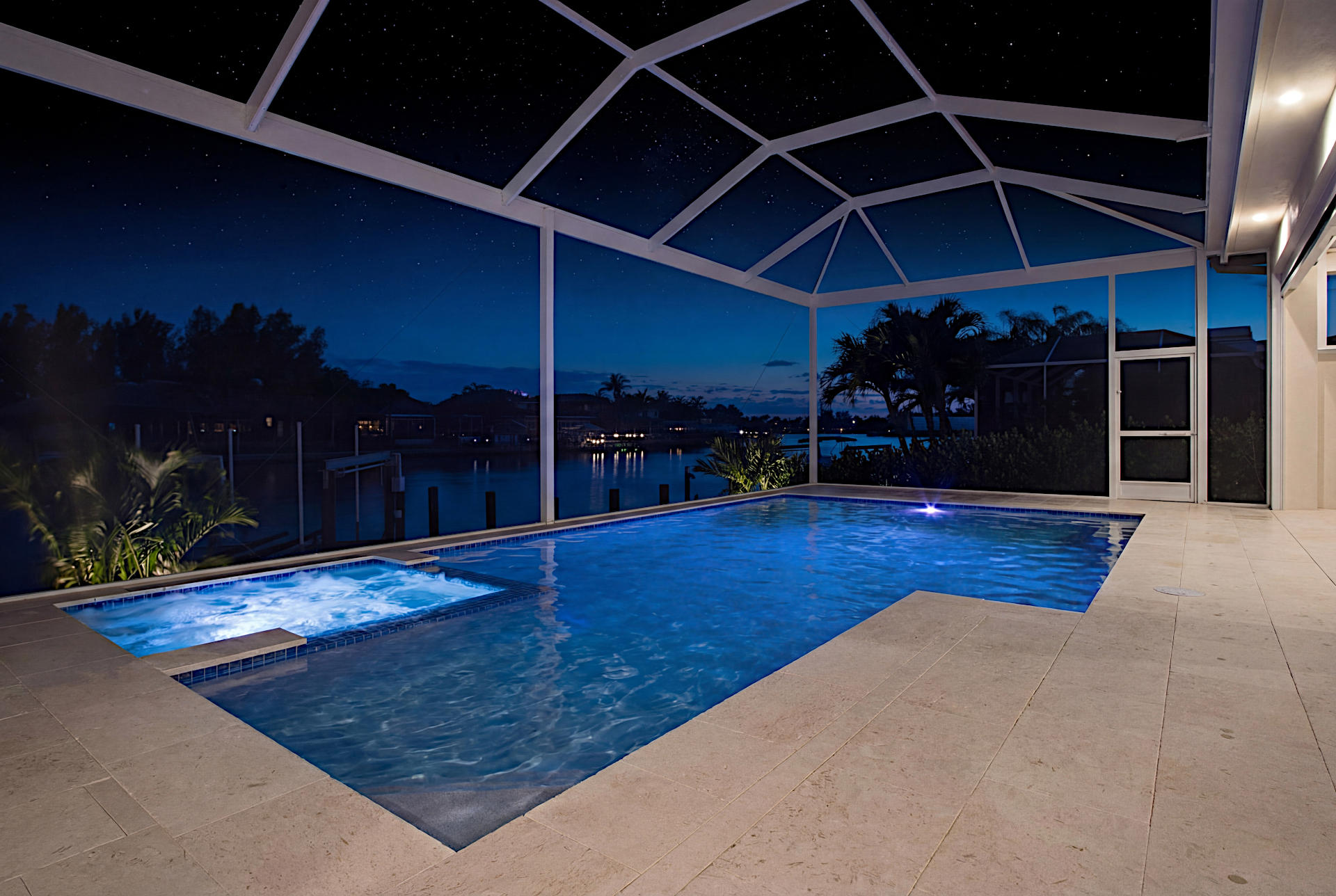 Der Außenbereich ist etwas ganz Besonderes! Das Haus befindet sich an einer Wasserkreuzng und bietet einen atemberaubenden Blick über die Kanäle. Der Infinity-Pool mit Salzgenerator, Spa bietet ebenfalls einen wundervollen Blick auf das Wasser. Großzügige Liegestühlen ermöglichen das Sonnenbaden und Entspannen unter der Sonne Floridas. Die Außen-Sitzbereiche sind teilweise beschattet und komplett mit Außenküche mit eingebautem Infrarot-Grill, einer Spüle und einem Esstisch. Es gibt auch einen separaten Lounge-Bereich, ideal um morgens oder spät abends Getränke in Gesellschaft zu geniessen. Sie können vom privaten Dock aus angeln oder einfach den Blick aufs Wasser genießen.